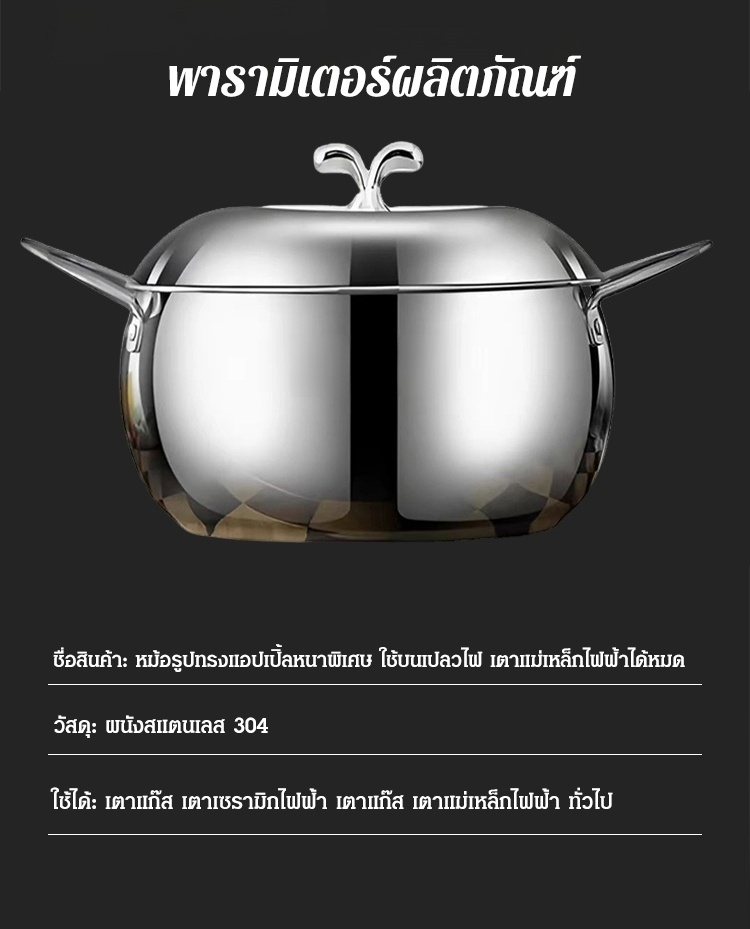 หม้อรูปแอปเปิ้ลสแตนเลสหนาพิเศษ ใช้กับเปลวไฟและเตาแม่เหล็กไฟฟ้าได้